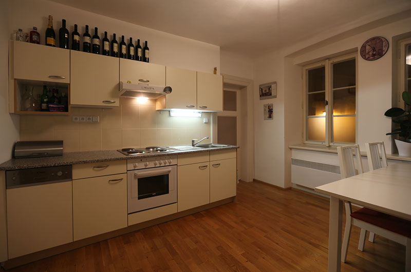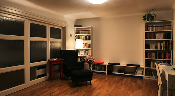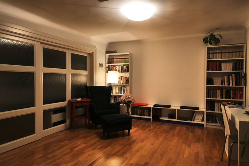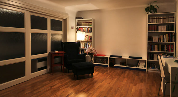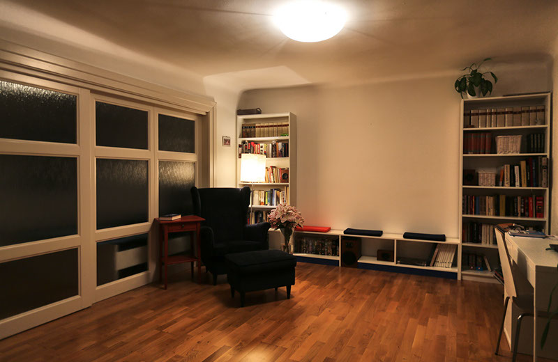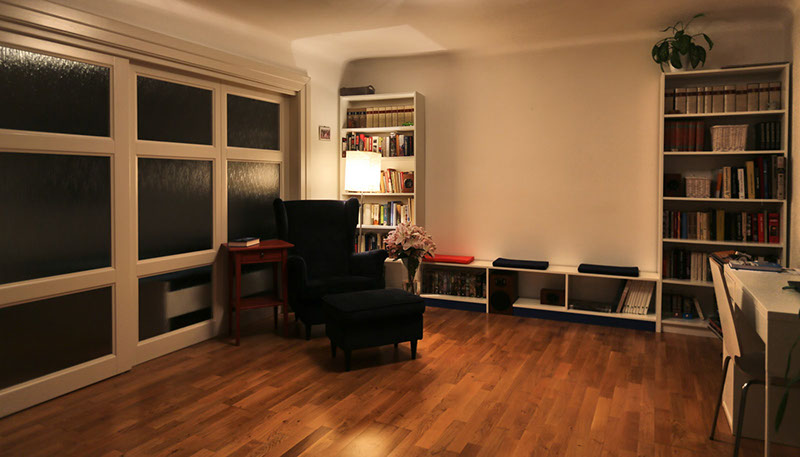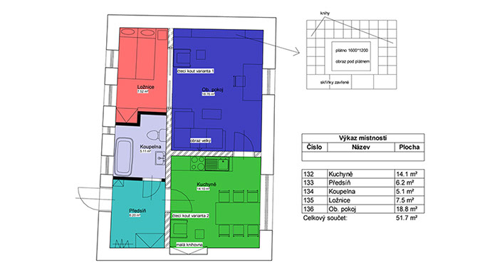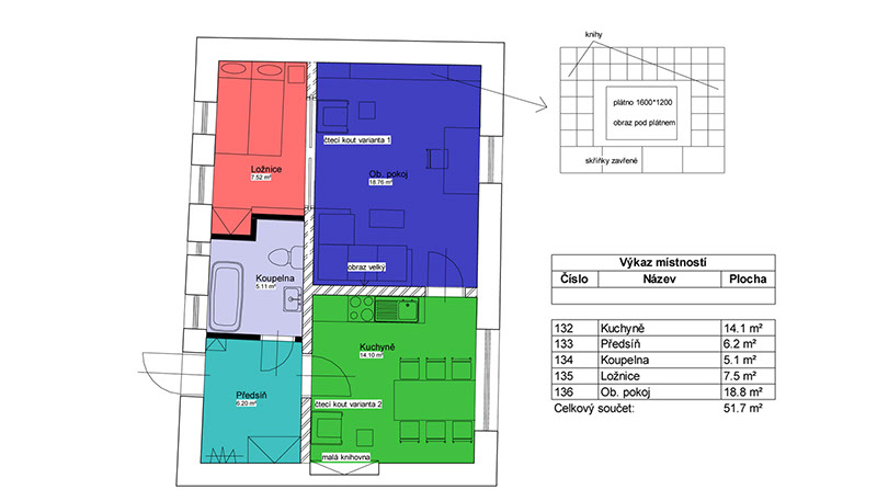 Interiér bytu v ulici Úvoz v Praze na Malé Straně. Řeší ideálně bydlení pro "singles" či bezdětný pár malou ložnicí oddělenou od obývacího pokoje pouze posuvnou stěnou z mléčného skla.