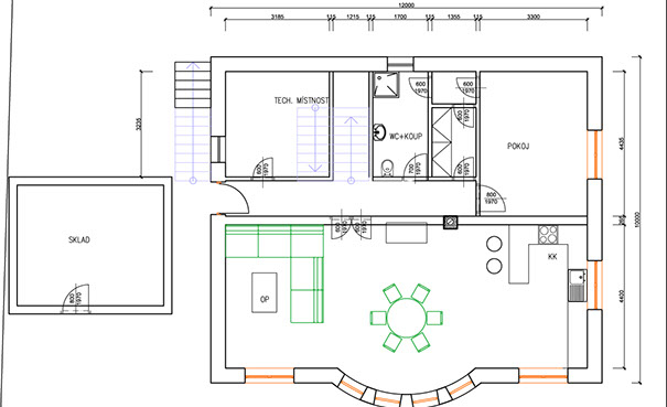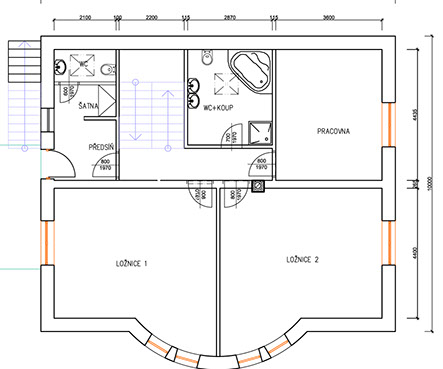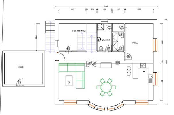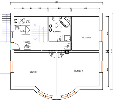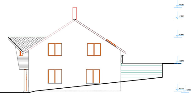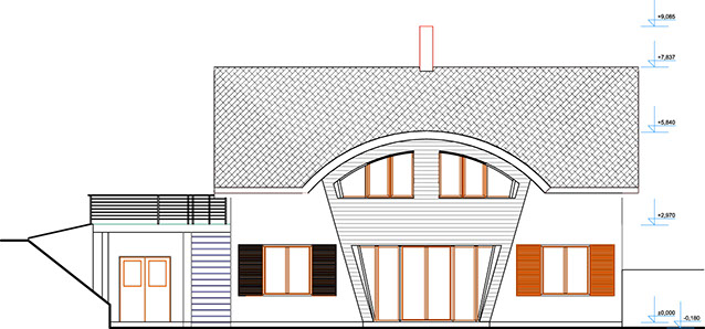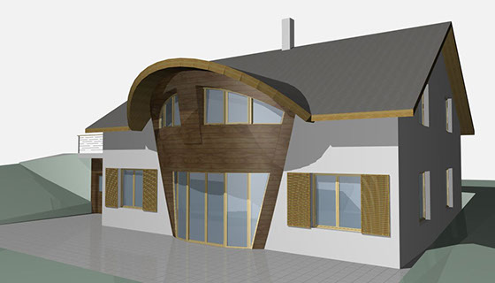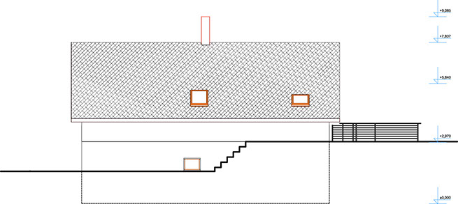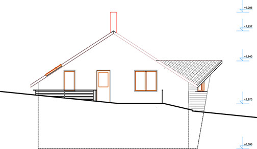 Dům ve svahu je orientován jižně do zahrady s přímo famózním výhledem, kam se také dům otvírá kónickým proskleným rizalitem. Tento jinotvar vznikl v důsledku hloupého regulativu na sedlovou střechu a požadavku klienta na dům ve tvaru kužele...