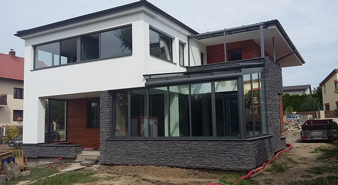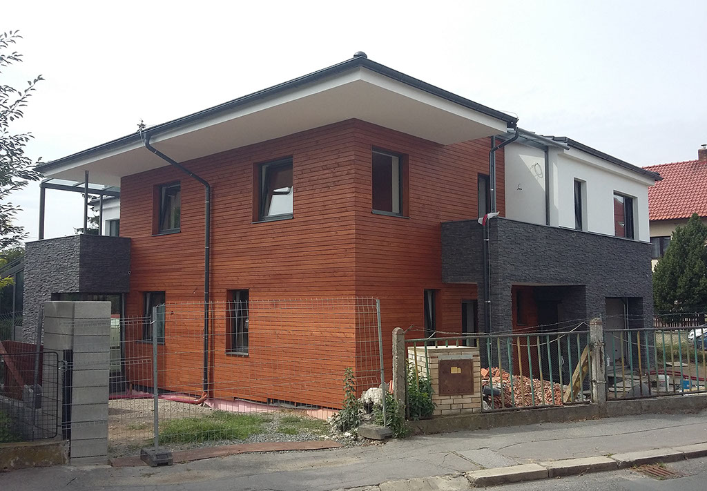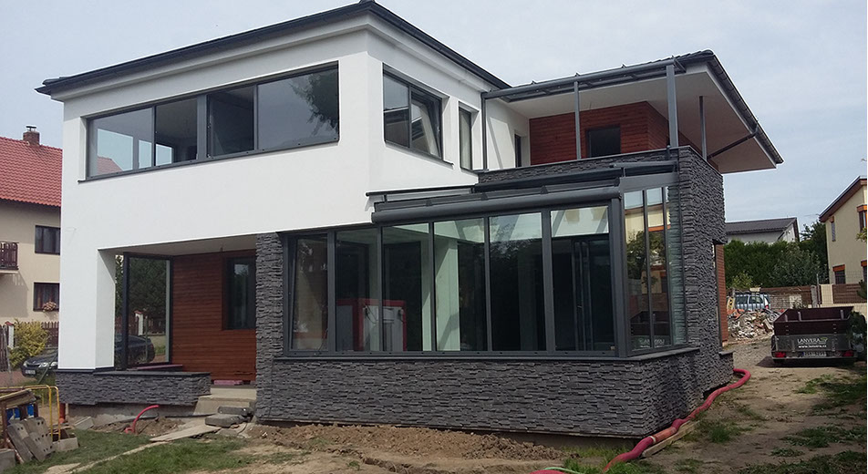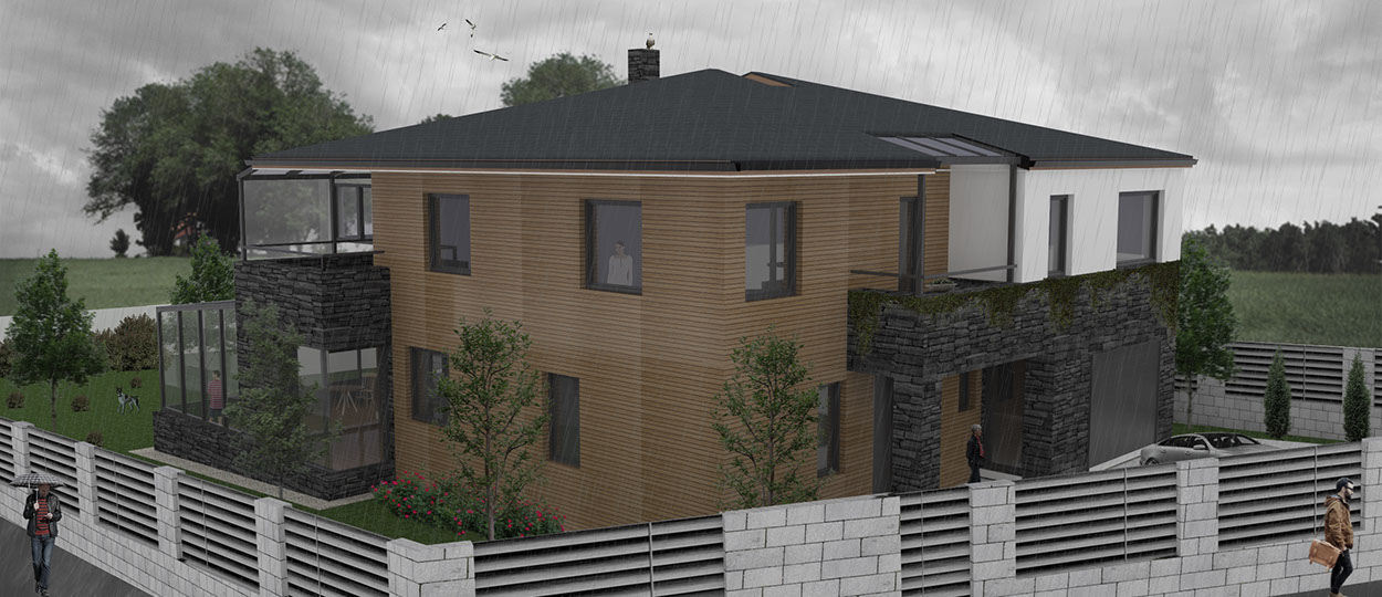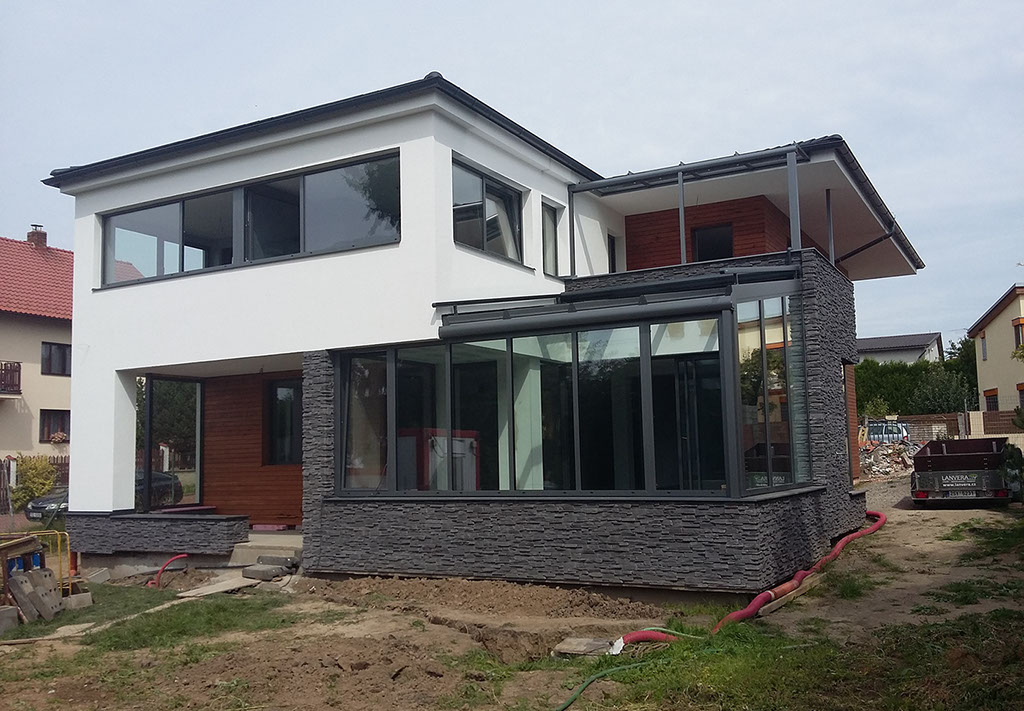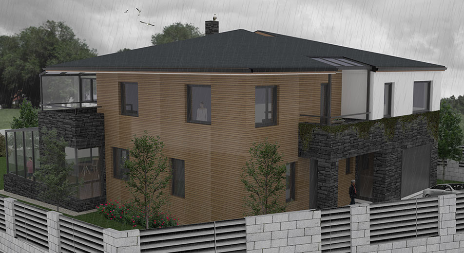 Dvougenerační rodinný dům v Kolovratech u Prahy oslní svou interiérovou velkorysostí, kde se potkávají různě prosvětlené prostory s centrem dění ve velké světnici propojené se zimní zahradou v přízemí a galerií v patře. Pro exteriér bylo použito kombinace dřevěného obklady, bílého štuku a čediče, prvků zdánlivě odlišných, ale vyváženě se doplňujích v kontrastní hře všech fasád.