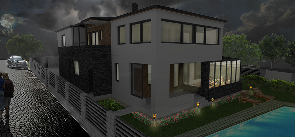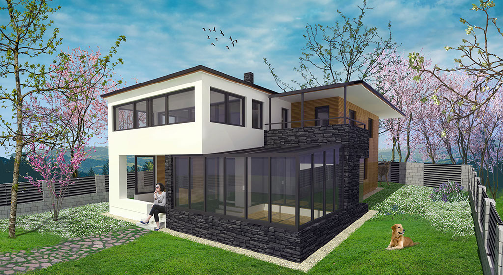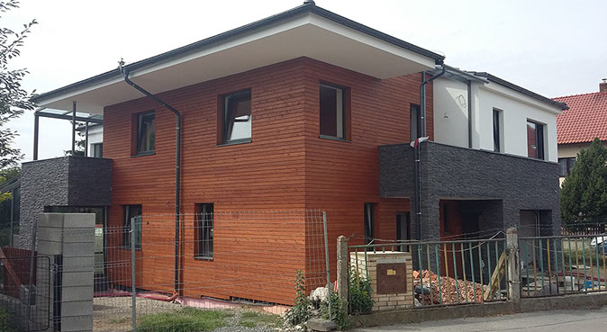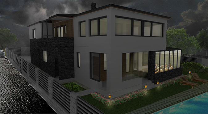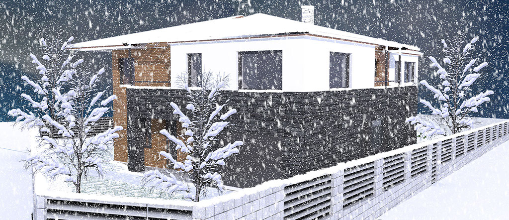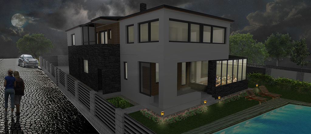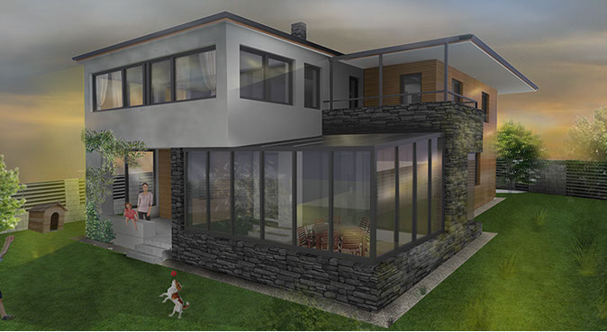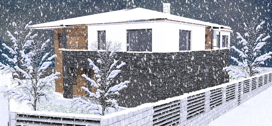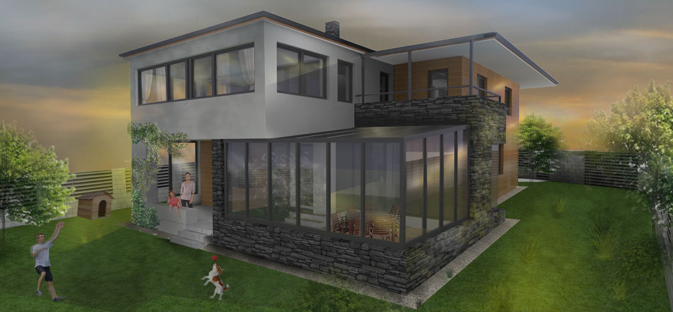 Dvougenerační rodinný dům v Kolovratech u Prahy oslní svou interiérovou velkorysostí, kde se potkávají různě prosvětlené prostory s centrem dění ve velké světnici propojené se zimní zahradou v přízemí a galerií v patře. Pro exteriér bylo použito kombinace dřevěného obklady, bílého štuku a čediče, prvků zdánlivě odlišných, ale vyváženě se doplňujích v kontrastní hře všech fasád.