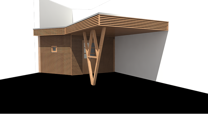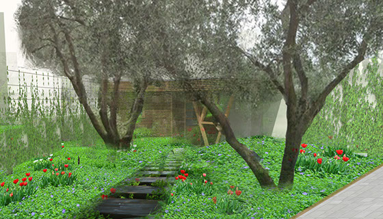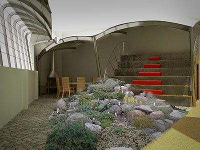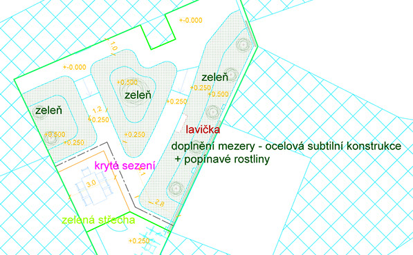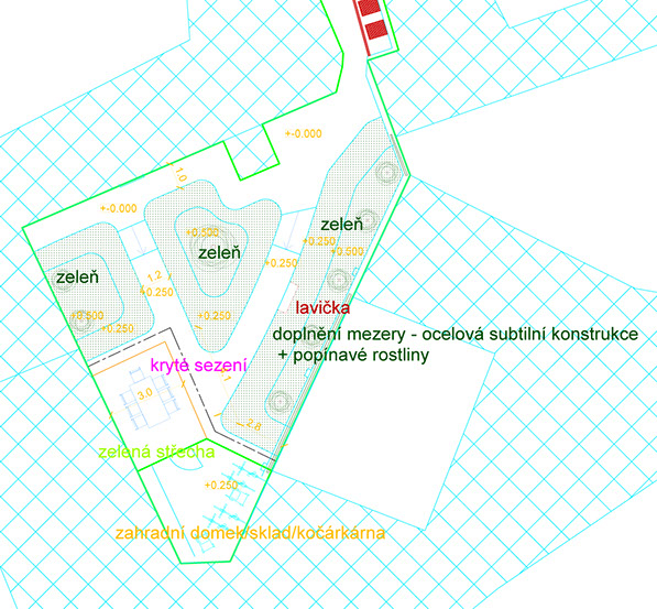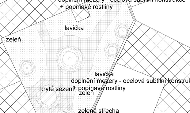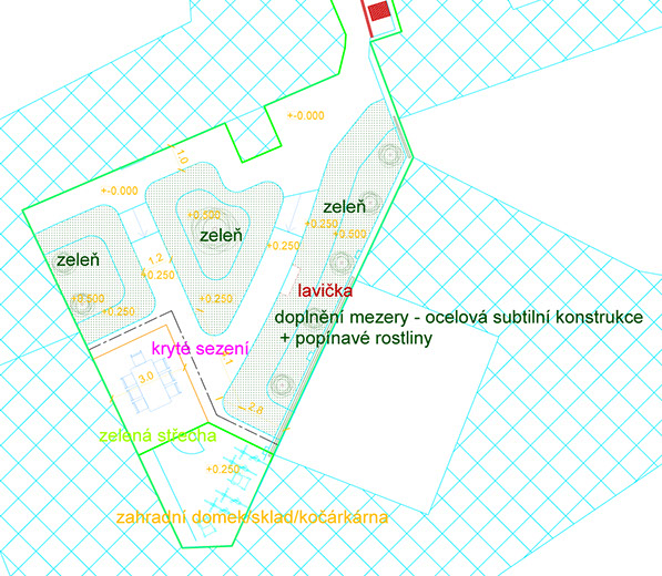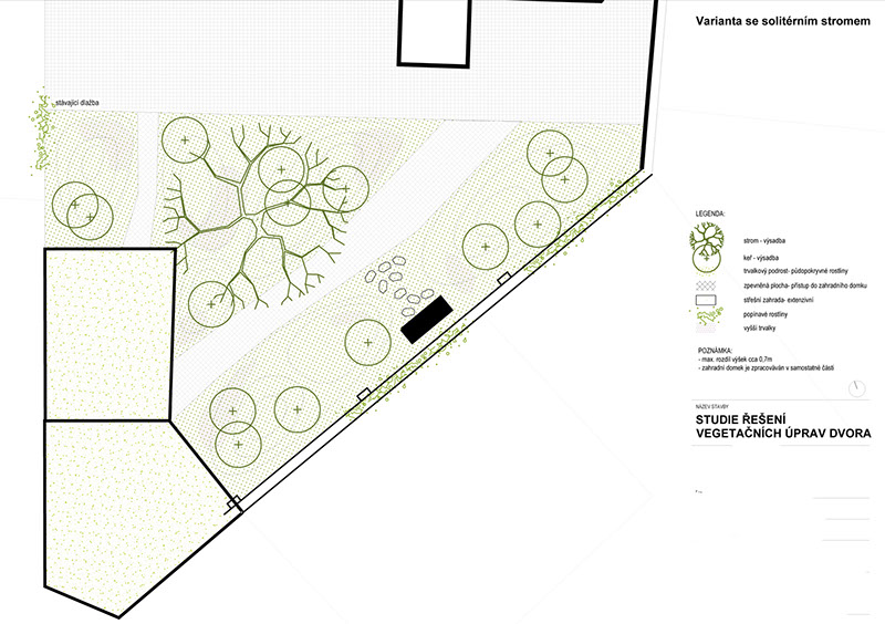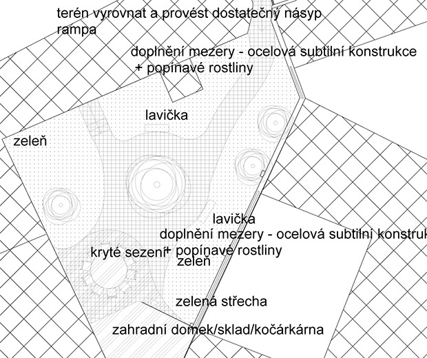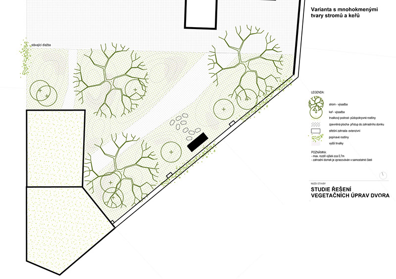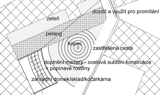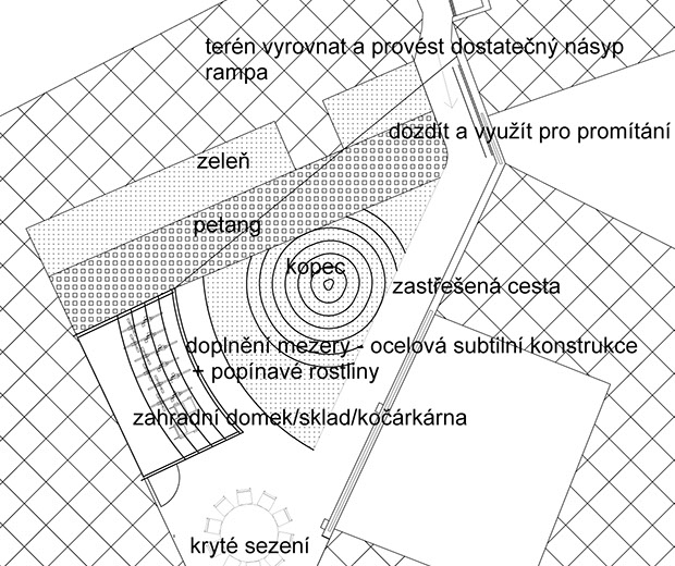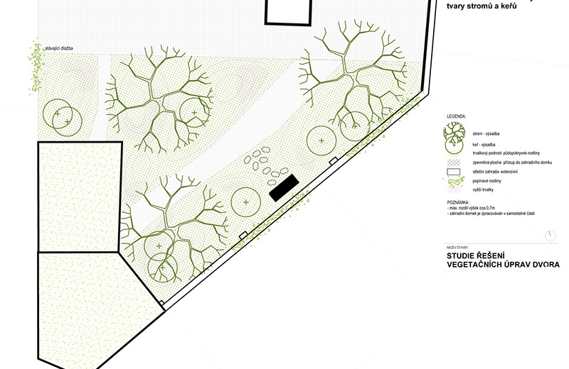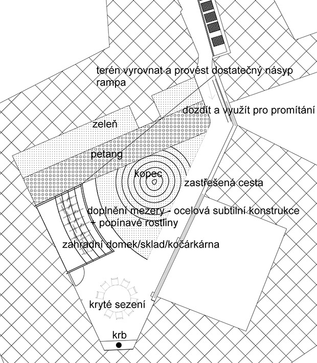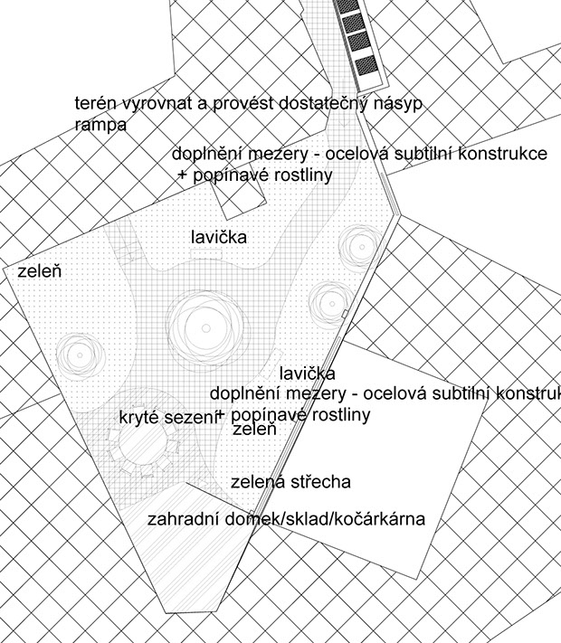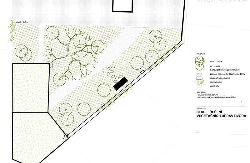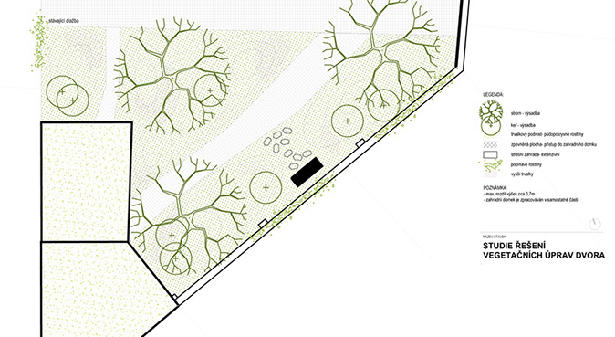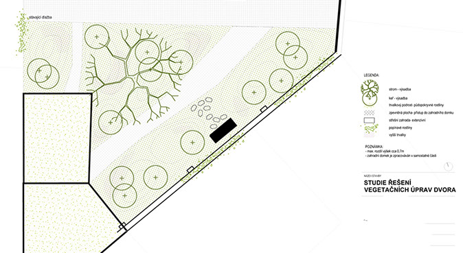 Ve vnitrobloku ve Vězeňské ulici v Praze na Starém Městě se nacházela stará dílna, později ateliér. Stavba byla v dezolátním stavu, a tak se rozhodlo zpracovat variantní studii na adaptaci dvora. Z původních asi šesti variant zůstaly ve hře dvě - jedna s poněkud aktivnějším využitím (petang, plátno na promítání, grilování) a druhá relaxační - vítězná. Dílna byla stržena a nahrazena zahradním domkem pro skladování nářadí, kol a kočárků a původní zpevněná plocha se osází nenáročnou různorodou zelení...